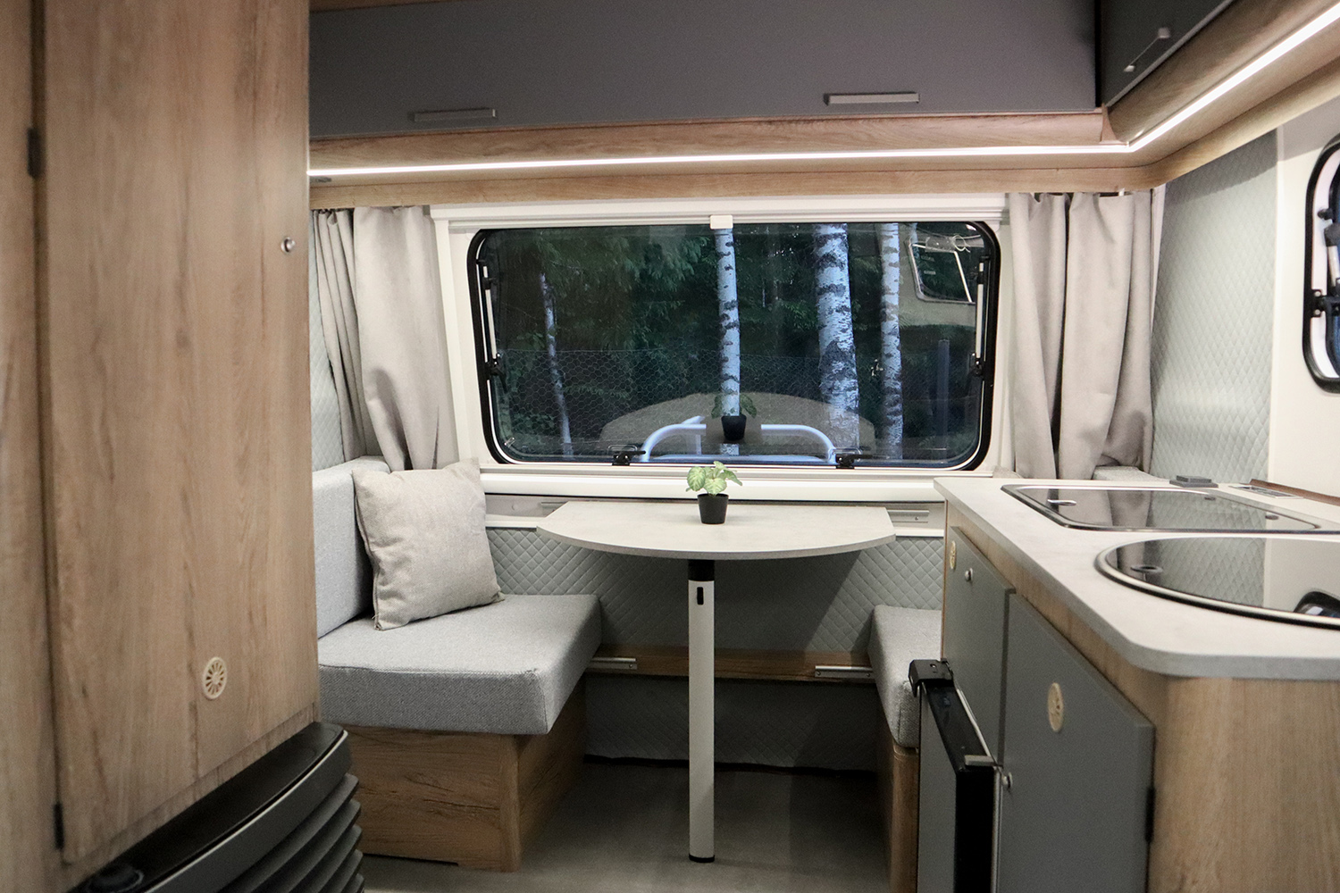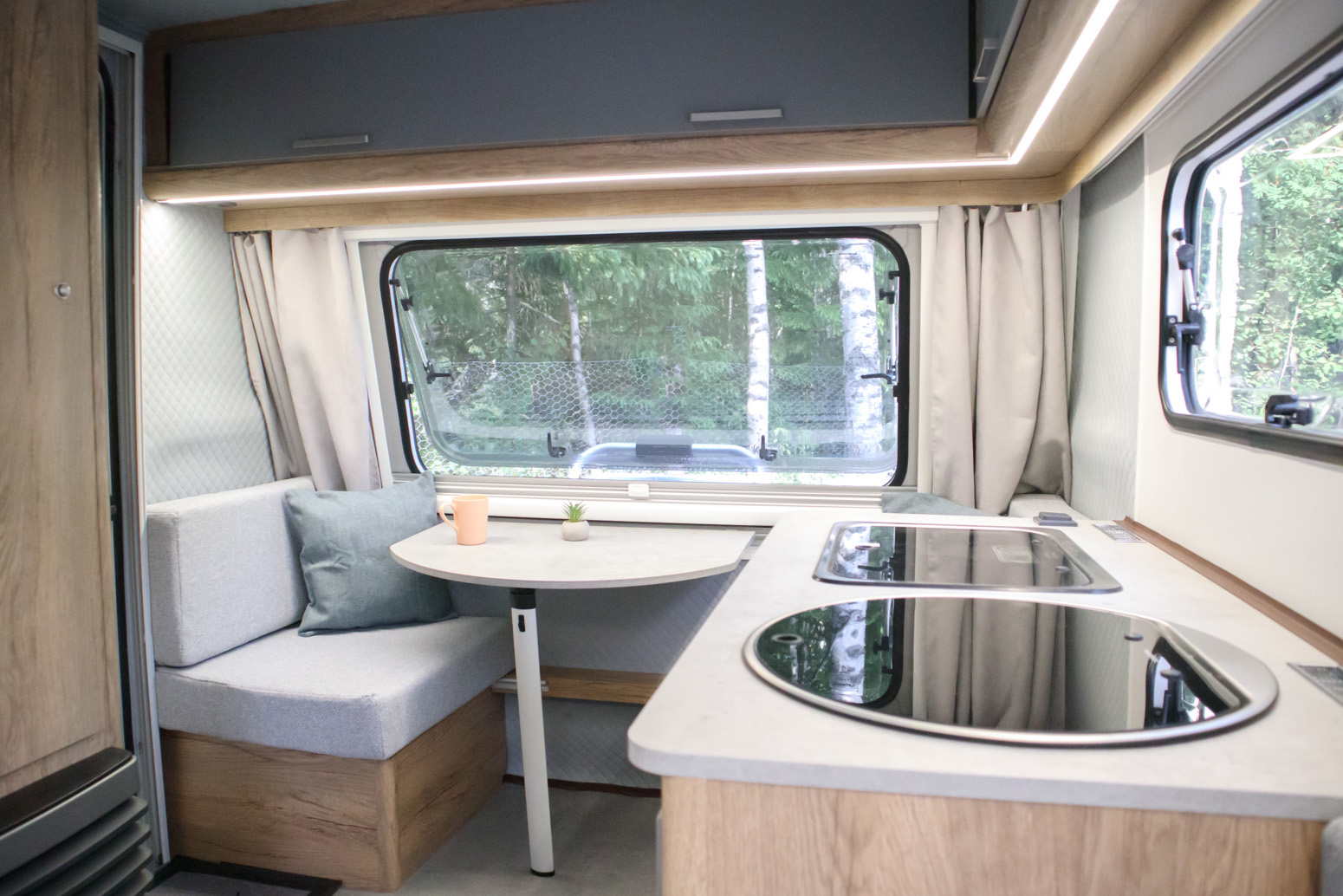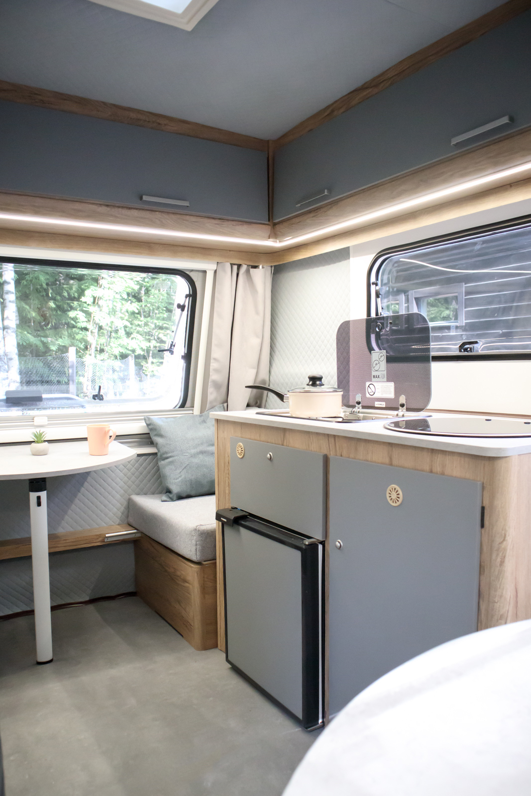 Poksilla voit retkeillä omavaraisesti kaasun ja 12v akun avulla tai vastaavasti voit käyttää pihasta tai leirintäalueelta saatavaa 220v sähköä. Poksi N on hyvä vaihtoehto vaikkapa pariskunnille, pienelle perheelle tai ensi kertaa vaunuileville.